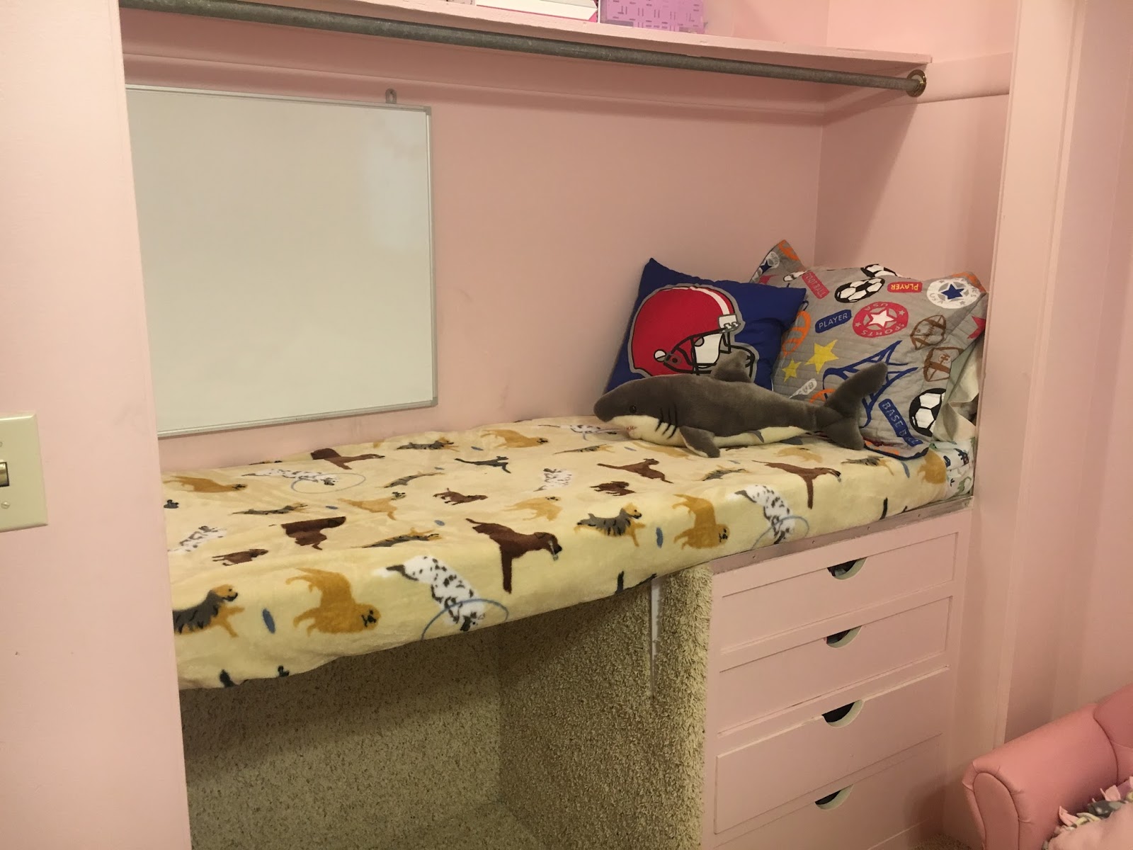 So while we are doing some remodeling downstairs we brought Hank upstairs for awhile.  So we decided to make him a closet bed!!!  He was so excited!!!  Once we have the remodeling done and he decides he is ready to go back downstairs it will be an easy take down if the girls want it down or we can leave it up to have a reading nook or a fun place to play....  Matt did an awesome job making it!!!  Hank was one little happy camper for his new closet bed!!!